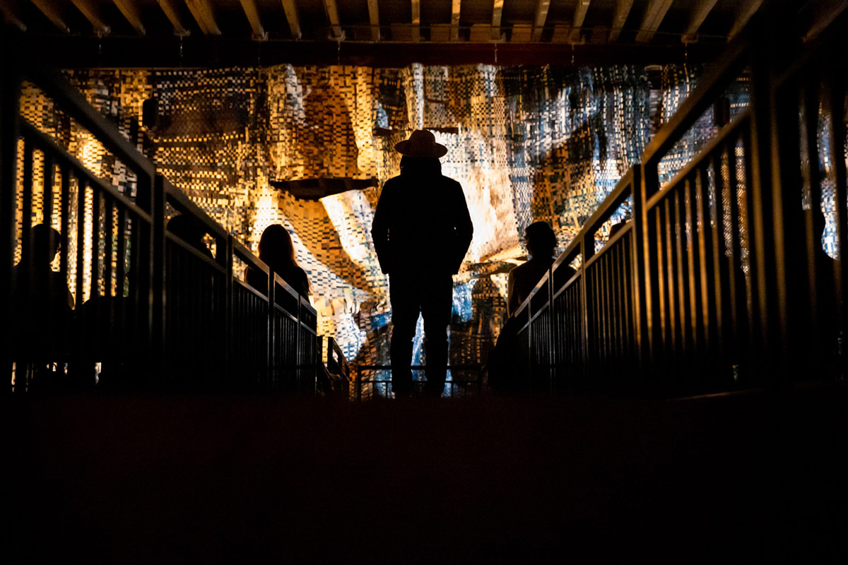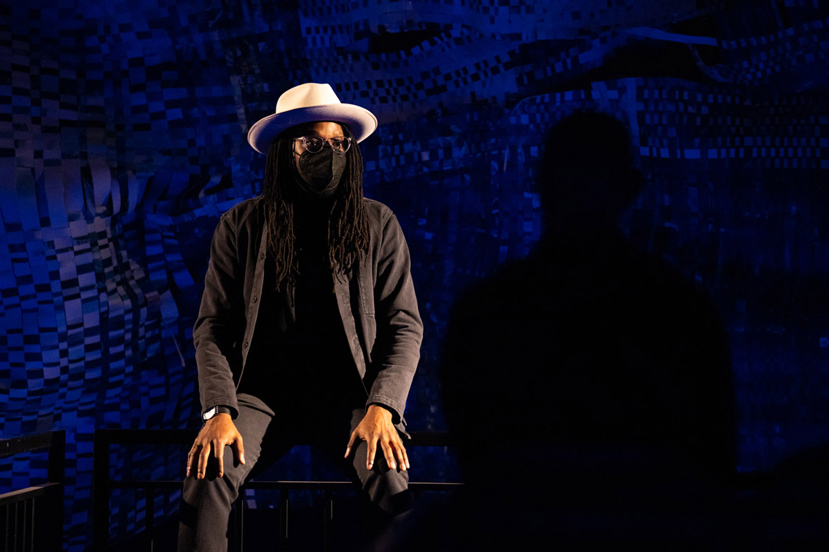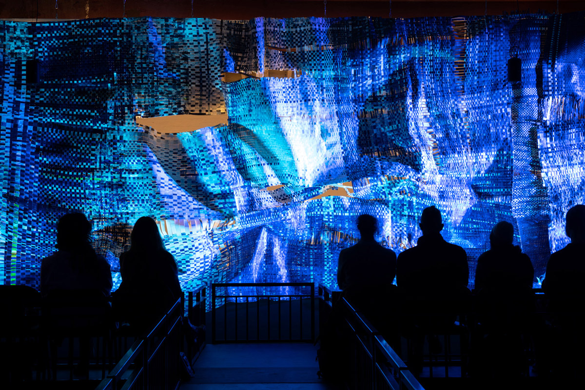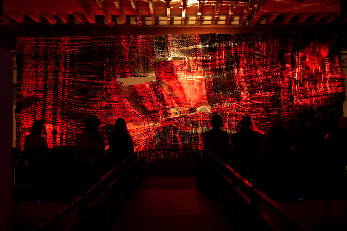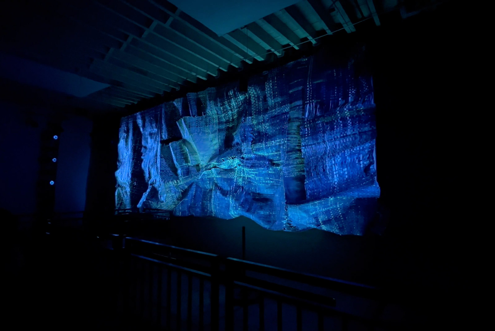 Aquifer of the Weave, 2021. Installation of cyanotype weaving, light and 4DSound, 36 × 17 feet, 45 minutes.