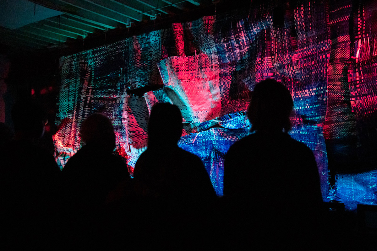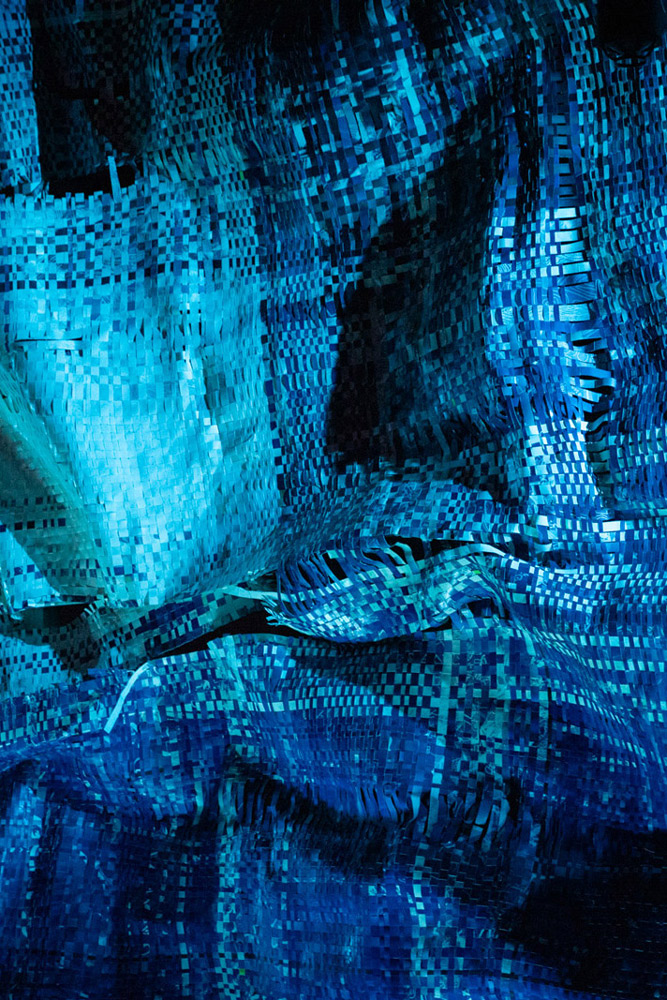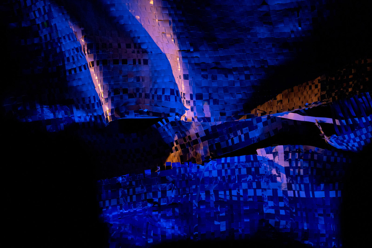 “In the stillness and blue, you lead yourself up the ramp to the dock, an elevated T-shaped platform that sits at the base of the installation. It’s here that you find your seat, your viewing angle, your vessel. Set up as an intimate experience, you find yourself amongst only a handful of souls, each with a direct line of sight to the suspended weaving before you. Crinkled and towering high above the audience, the presence of the tapestry defies the simplicity of the paper and plain weave structure that it’s made of. For the next forty-five minutes, it is on this surface–all at once a sculpture, a textile, a theatrical set, a screen, a raft, a living breathing being–that the performance is transcribed onto, transforming it into a material of both physical and psychological projection. As the sound begins and the lights slowly flicker, the trance that ensues elicits the feeling of a one-to-one performance.